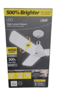 For garages, attics and other dark spaces, the Feit Electric ADJ4000/3K/LED panel light provides an efficient andflexible way to get bright illumination in a small form. This light comes with independently adjustable panels that folddown up to 90 to direct light exactly where desired. Integrated LEDs produce 4000 Lumens of 3000K Warm Whitecolor temperature light using only 40 watts a savings of over 85% compared to an equivalent 300 watt incandescent.Each light lasts up to 20,000 hours delivering bright, reliable illumination. The versatile 3 adjustable panel LED daylight light is non-dimmable and suitable for a variety of general purpose applications including indoor, workspace, garage or patios.