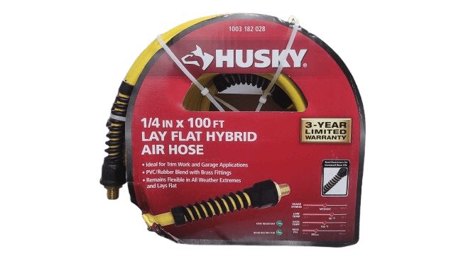 Husky Lightweight Hybrid Air Hose is constructed with a specialized blend of rubber and PVC, making it great for roofers using pneumatic tools. It will lay flat better than any other hose and offers extreme all-weather flexibility, even in sub-zero conditions (minus 40°F to 140°F). The bend restrictors are field-repairable to reduce wear and tear.