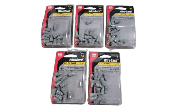 14 pack screw on wire connectors 1 #20 with 1 #22 through 2 #16 wires. Thermoplastic shell with square spring card of 14 Tight, square-wire spring threads directly onto conductors for fast connections with no slip. Tightens without ratcheting, easily removed for repeat usage on same size combination or larger. Fluted shell surface permits a firm grip for easy finger-tight c onnections. Thermoplastic shell shields against environmental extremes. Flame-retardant properties resist heat distortion up to 221 degrees Fahrenheit. Superior flash-over protection. High-dielectric shell features deep skirt design to prevent exposure of bare wire. Buttress threads screw into wire insulation. For copper to copper connections only.
