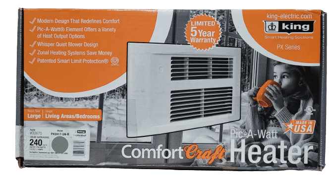 KING redefines comfort with the modern architectural design of the PX series ComfortCraft wall heater. The PX series heater delivers nearly 100% efficient electric heat, perfect for large living areas yet whisper quiet enough for bedrooms. The premium combination of an efficient high-mass steel element and whisper quiet squirrel cage blower, offers top of the class performance and years of trouble-free operation. For best results use with an electronic line voltage wall thermostat. Also available with a built-in thermostat. KINGs exclusive Pic-A-Watt heating element allows customers to select from a range of wattage options, tailoring the heater to a rooms specific heating requirements. For smaller areas, chose a lower wattage to efficiently heat the room. For larger rooms, choose a higher wattage and maximize comfort. It’s as easy as unplugging a wire to select the wattage during installation. Now That’s Smart.