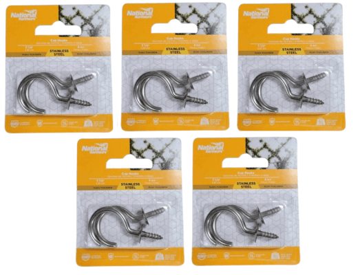 1-1/2 inch, stainless steel, cup hook, designed for use in kitchens, craft projects, hanging exterior decorations, etc, visual pack. Safe Working Load (SWL) 15 lbs.