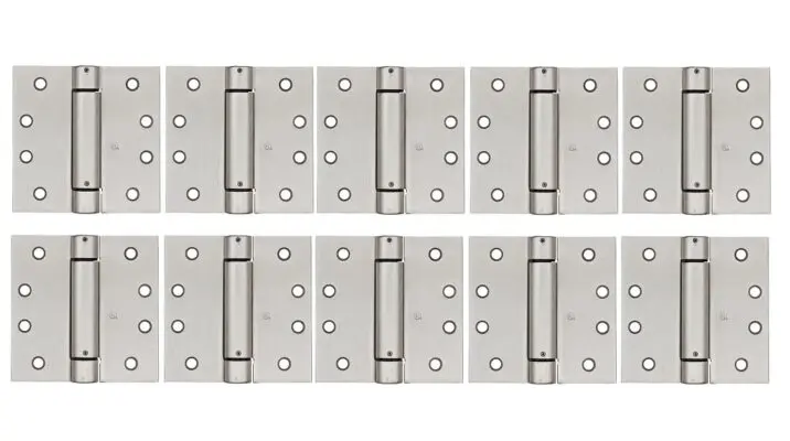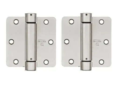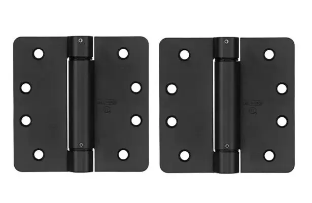 4 Inch spring adjustable self closing door hinge, manufactured with cold rolled steel, closing speed is adjustable, fits standard cutouts, tension is adjustable, 5/8 inches radius round corners. Hinge is UL approved for fire doors which must use a minimum of 2 spring and one conventional hinge per door. Doors weighing up to 50 pounds require 1 spring hinge, doors up to 85 pounds require 2 spring hinges. Doors up to 110 pounds require 3 spring hinges. Conforms to ANSI/BHMA Standard A156.17-2004. *NFPA-80 requires fire labeled doors to have a minimum of 2 spring hinges. NOTE: All hinges must have pivot points aligned for smooth operation. Always use same hinge sizes.