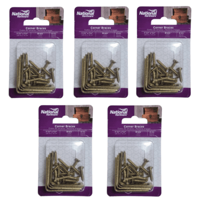Corner Braces 1-1/2 By 5/8 By 0.08 Inch Brass Finish Steel 4 Pack With Screws. Hole sizes fit Phillips Flat Screws sized #7. Drill a pilot hole with a 3/32 inches sized drill bit when using wood screws. Designed for chests, screens, windows, furniture, etc. Used for reinforcing inside of right angle corner joints. Screw holes are countersunk.