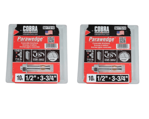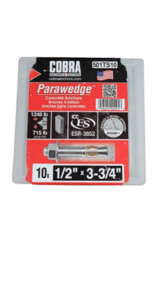 The Parawedge anchor stud from Cobra is cold formed and consists of a threaded section with standard coarse bolt threads at 1 end, and a parabolic mandrel at the opposite end for a smoother expansion. It has a 360° one-piece clip that functions as a 2-piece clip for more contact, a torque controlled expansion, and can be installed into a bottomless hole. 3 head styles are available: Hex Nut, Wire Hanger and Tie Down Hook. More than 39 sizes are available, in 2 types of material: Carbon steel and 304 Stainless steel. Approvals: UL. Underwriters Laboratory – File #EX 4687.