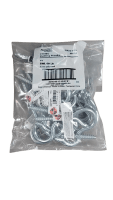 Ceiling hooks steel zinc plated – bulk pak length 4-1/8 inch. Ceiling hooks steel zinc plated – bulk pak length 4-1/8 inch. #3, 4-1/8 inch, ceiling hook, zinc, holds up to 60 lb, bulk, boxed. Designed for hanging home and industrial products. Sharp points bite into wood quickly and easily.