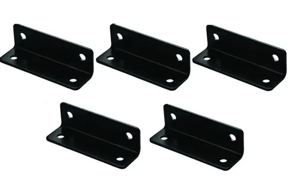 Wide Corner Brace 1.6 Inch By 5 Inch By 1/8 Inch Black Powder Coated Steel. Used for reinforcing 90 degree angles by application to the inside or outside of the corner. Wider width provides greater area of stability for long intersections of building materials. 3/8 inch diameter holes. Black powder coat finish for improved weather resistance. Boxed loose.
