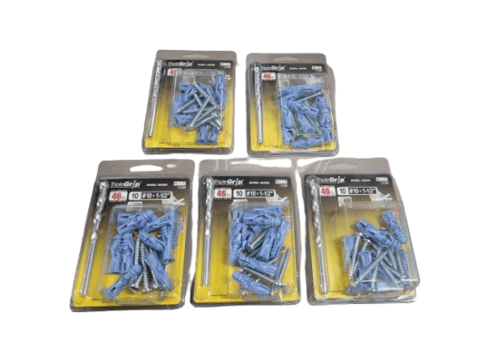 Wall anchors universal #10 blue anchors with screws – 10 pack Superior holding power, 2 expandable wings that grips tight behind drywall, 2 lateral wings holds the anchor in place. Cam action expands inside drywall while inserted. Maximum loads of pull 45 pounds and shear 75 pounds in 3/8 drywall. Install into a 5/16 inch pilot hole.
