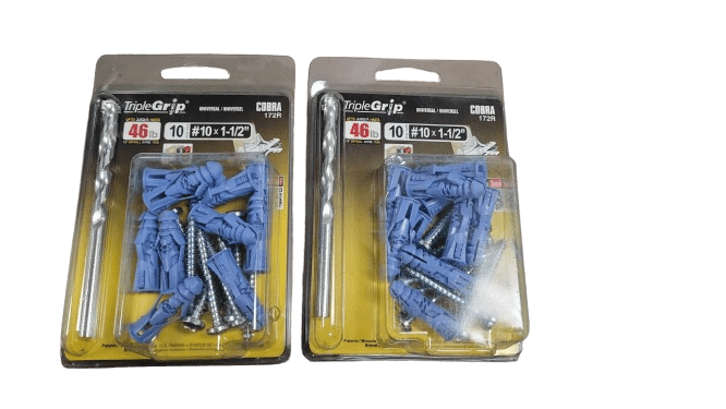 The TripleGrip R is one of the most technologically advanced anchor on the market. It is designed with two expandable wings that grip tightly behind the drywall for a maximum holding power. Its advanced cam-action technology expands; thereby creating an additional pressure against the side walls of the drywall or masonry. This also provides more stability and strength. Two lateral wings hold the anchor in place, preventing any rotation while the screw is inserted. Superior holding power, 2 expandable wings that grip tightly behind drywall, 2 lateral wings hold the anchor in place, plus drill bits. Cam action expands inside drywall while inserted.