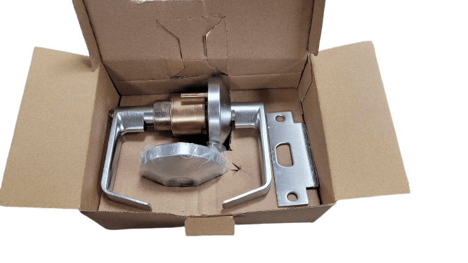 Entry/office lock – Turn/push button locking. Pushing and turning button locks outside lever requiring use of key until button is manually unlocked. Push button locking. Pushing button locks outside lever until unlocked by key or by rotating inside lever. Inside lever always free. Deadlocking latch bolt.