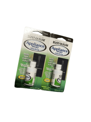 Black Rust-Oleum Specialty Appliance Touch-Up.6 ounce jars with brush in cap repairs scratches and chips on refrigerators, washers, dryers, dishwashers and other non-heated surfaces (do not apply to ovens or stoves). Applies to metal, porcelain and enamel surfaces. Includes a tapered brush underneath the cap. Ideal for repairing scratches and chips on appliances. Quick-dry acrylic lacquer formula provides a long-lasting, high-gloss finish. For best results apply multiple layers to deep scratches.