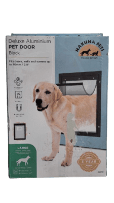 Give your pet the freedom to come and go as they please. This Large Deluxe Aluminum Pet Door with adjustable tunnel can be used for large dogs up to 100 lbs. The outer frame measures 19.3 in. x 13.8 in. and flexible flap measures 16.1 in x 11.4 in, with a robust vinyl flap suitable for even the most energetic dogs. This pet door is uniquely designed for doors, screens and walls up to 2.8 in. thick to allow your 4-legged friend the freedom he or she needs for happiness and health. The two way access allows your pet open access with magnetic centering flap to ensure the door shuts after each us. You can also change the access to locked with the locking panel keeping your pet inside or out. Have complete peace of mind knowing that the Deluxe Aluminum Pet Door is designed to last and includes an industry leading 3 year limited warranty. SELECT THE RIGHT SIZE: This Large Deluxe Aluminum Pet Door is suitable for large dogs up to 100 lbs. use the steps below to ensure a perfect fit, 1.Width – Measure the widest part of your pet, usually across the chest. Add an inch 2. Height – Measure your pet from the bottom of the chest or belly to the top of the shoulders, whichever is the tallest part. Add an inch 3. Select Size – Based on your pets width and height choose a door size that fits your pet correctlyImportant: Remember to allow for your pets future growth. Weight rating is to be used as a guide only. Use your pets measurements to select the correct size door.