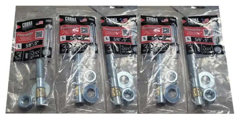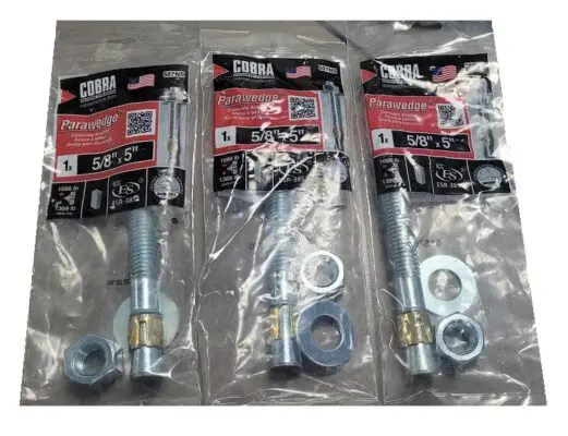 The Parawedge anchor stud from Cobra is cold formed and consists of a threaded section with standard coarse bolt threads at one end, and a parabolic mandrel at the opposite end for a smoother expansion. It has a 360° one-piece clip that functions as a two-piece clip for more contact, a torque controlled expansion, and can be installed into a bottomless hole. Three head styles are available: Hex Nut, Wire Hanger and Tie Down Hook. More than 39 sizes are available, in two types of material: Carbon steel and 304 Stainless steel. Approvals: UL.. Underwriters Laboratory – File #EX 4687