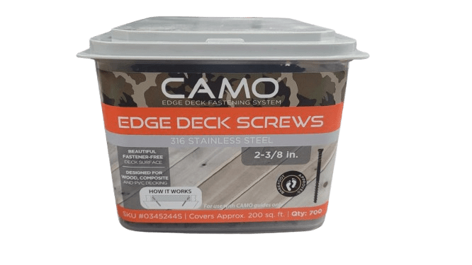 Hidden deck screws for any board. Hide your deck screws with the CAMO MARKSMAN system. Any wood or composite board in any square or grooved board profile, Edge hidden deck screws are the best way to enjoy the beauty of your deck top without seeing your fasteners. Edge hidden deck screws are installed on the edge of the deck board, hiding the fastener while protecting the face of the deck board. The rake tip design of the screw augers material as it is driven, leaving you with a fastener free deck surface that is less prone to splitting and cracking. Not only does this system improve the overall look of your deck, but it holds stronger than a traditional face fastener. When a deck board is face fastened, the head of the screw or nail is keeping your board in place. Edge hidden deck screws leverage the strength of the entire screw to hold your deck board in place. Edge Hidden Deck Screws are easy to install using either the CAMO DRIVE system or the Marksman system. Available in PROTECH exterior coating and 316 stainless steel.