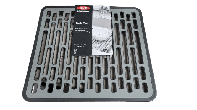 Keep your dish pit clean and organized with this OXO Good Grips 11 1/2″ plastic sink mat. Place this mat directly in the basin of your sink to protect the surface and the delicate dishes within from chipping, scratching, or sustaining other irreversible damage. The raised design offers ample drainage for quick, efficient drying for the dishes resting on top and for the mat itself after use. A non-slip base secures the mat directly to the sink’s surface, ensuring that your dishes are safe and secure while in use.
