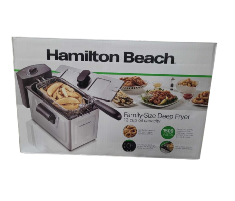 With the Hamilton Beach® Family-Size Deep Fryer, you can fry large quantities of restaurant-quality food in minutes. This Hamilton Beach Fryer It’s easy to use, even if you’ve never attempted to deep-fry food before. Simply fill the removable oil pot to at least the “MIN” level and turn the temperature dial to your preferred frying temperature. When the green ready light comes on, the oil is preheated, and you’re ready to fry. Then fill the frying basket with food without overcrowding it, lower the basket into the oil and top with the lid. When frying is done, remove the lid and hook frying basket over the oil pot to drain away excess oil. For easy cleaning, the removable oil pot, frying basket and lid are all dishwasher safe.