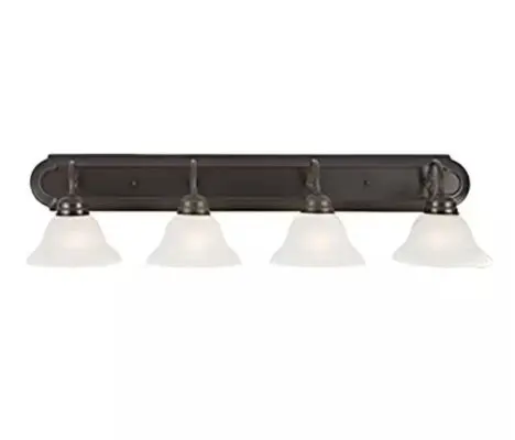 The Design House 517714 4-Light Millbridge Vanity Light is made of formed steel, soft alabaster glass and finished in oil rubbed bronze. This four-light wall mount is rated for 120-Volts and uses four 60-Watt medium base incandescent bulbs. This wall mount’s petite design mounts seamlessly to the wall without a chain or visible wires. Measuring 8-1/2 in. by 36 in., this 9.3 lbs. fixture can be mounted facing up or down depending on location and preference. Clean lines and sleek details accentuate the alabaster glass to create an elegant centerpiece in a bathroom. This Product is ETL and cETL listed. The Millbridge collection features a beautiful matching chandelier, wall sconce, ceiling mount and mini pendant. The Design House 517714 4-Light Millbridge Vanity Light comes with a 10-year limited warranty that protects against defects in materials and workmanship.