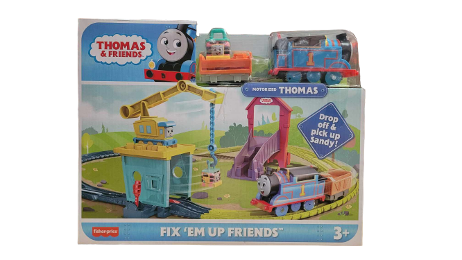 Preschoolers can relive memorable moments with their favorite characters from the Thomas & Friends show with the Fix ’em Up Friends track set from Fisher-Price. Along with a motorized Thomas engine, this train set features new characters, Carly the Crane and her best friend, Sandy the Rail Speeder! Carly the Crane uses her hook to lift and load the small engine into Thomas’ cargo car for a ride. After Thomas zooms around the full loop of track, he drops Sandy the Rail Speeder off at the slide to take her back down to Carly the Crane. This track set is compatible with other Thomas & Friends track, except wood.