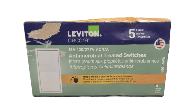 Leviton Antimicrobial Switch: 5601, 15 Amp 120-Volt/277-Volt Decora Rocker Single Pole AC Quiet Switch, White, 5-Pack. Antimicrobial Switches and Wall plates from Leviton help combat the spread of harmful bacteria and provide an extra-layer of protection. Antimicrobial additive inhibits 99% of bacterial growth when cleaned regularly. Replaces any standard single pole switch. Use with Decora Antimicrobial Wall plate sold separately.
