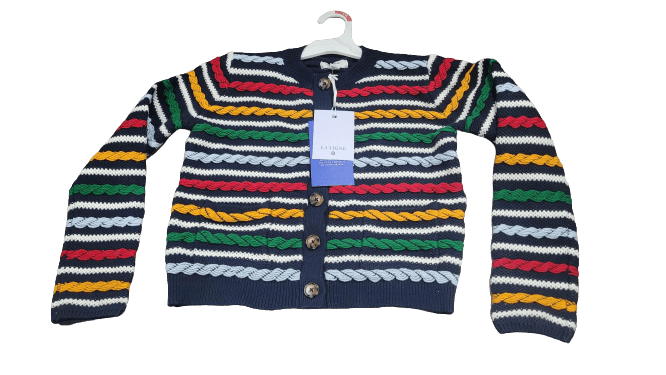 This below-waist cardigan is made from 100percent cotton in navy with red, yellow, white and green stripes. Long sleeves with ribbed cuffs help keep you snug and cozy, and the crewneck and full-length front buttons finish off the stylish look. Using the stripe as a muse, the three founders behind La Ligne create timeless pieces that can keep up with life’s every moment.