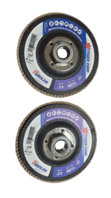 Tiger Paw 4.5 inch flat flap discs are designed for demanding metalworking applications like edge grinding on steel and stainless steel. Tiger Paw leverages 100% zirconia alumina grain that holds up under high temperatures and extreme pressure delivering high performance on heavy duty applications.