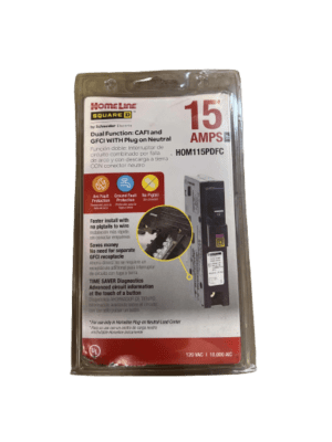 Square D by Schneider Electric Homeline 15 Amp 1-pole Plug-on Neutral Dual Function Circuit Breaker is a space and labor saving device, engineered to meet prevailing National Electric Code requirements. This device combines 2 critical technologies; Combination Arc Fault protection and ground fault protection (class A), in a single, easy-to-install device. The National Electric Code now requires both Combination Arc Fault and ground fault protection on all 1-Pole, 15 Amp and 20 Amp kitchen and laundry circuits. Prior to the release of this new device, a contractor or homeowners only choice would have been to use a Combination Arc Fault circuit breaker in conjunction with an expensive, bulky ground fault receptacle. The new dual function circuit breakers help reduce cost and eliminate the hassle of using 2 separate devices to provide this essential protection. It’s a win for contractors and homeowners alike. Designed for reliability, the Homeline Plug-on Neutral Dual Function Circuit Breaker connects directly to the neutral bar, providing a time and labor-saving installation. Several advantages from the plug-on neutral design are fewer connections which lead to faster installation and an innovative neutral clip eliminates pigtails which in turn frees gutter space. Like all Square D CAFI circuit breakers, it is integrated with time saver diagnostics, a unique feature that provides additional circuit information and minimizes troubleshooting at the touch of a button.
