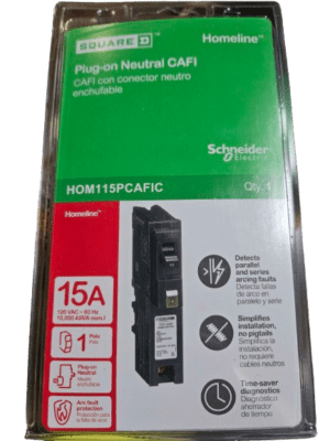 Square D by Schneider Electric Homeline 15 Amp 1-pole Plug-on Neutral Dual Function Circuit Breaker is a space and labor saving device, engineered to meet prevailing National Electric Code requirements. This device combines 2 critical technologies; Combination Arc Fault protection and ground fault protection (class A), in a single, easy-to-install device. The National Electric Code now requires both Combination Arc Fault and ground fault protection on all 1-Pole, 15 Amp and 20 Amp kitchen and laundry circuits. Prior to the release of this new device, a contractor or homeowners only choice would have been to use a Combination Arc Fault circuit breaker in conjunction with an expensive, bulky ground fault receptacle. The new dual function circuit breakers help reduce cost and eliminate the hassle of using 2 separate devices to provide this essential protection. It’s a win for contractors and homeowners alike. Designed for reliability, the Homeline Plug-on Neutral Dual Function Circuit Breaker connects directly to the neutral bar, providing a time and labor-saving installation. Several advantages from the plug-on neutral design are fewer connections which lead to faster installation and an innovative neutral clip eliminates pigtails which in turn frees gutter space. Like all Square D CAFI circuit breakers, it is integrated with time saver diagnostics, a unique feature that provides additional circuit information and minimizes troubleshooting at the touch of a button.