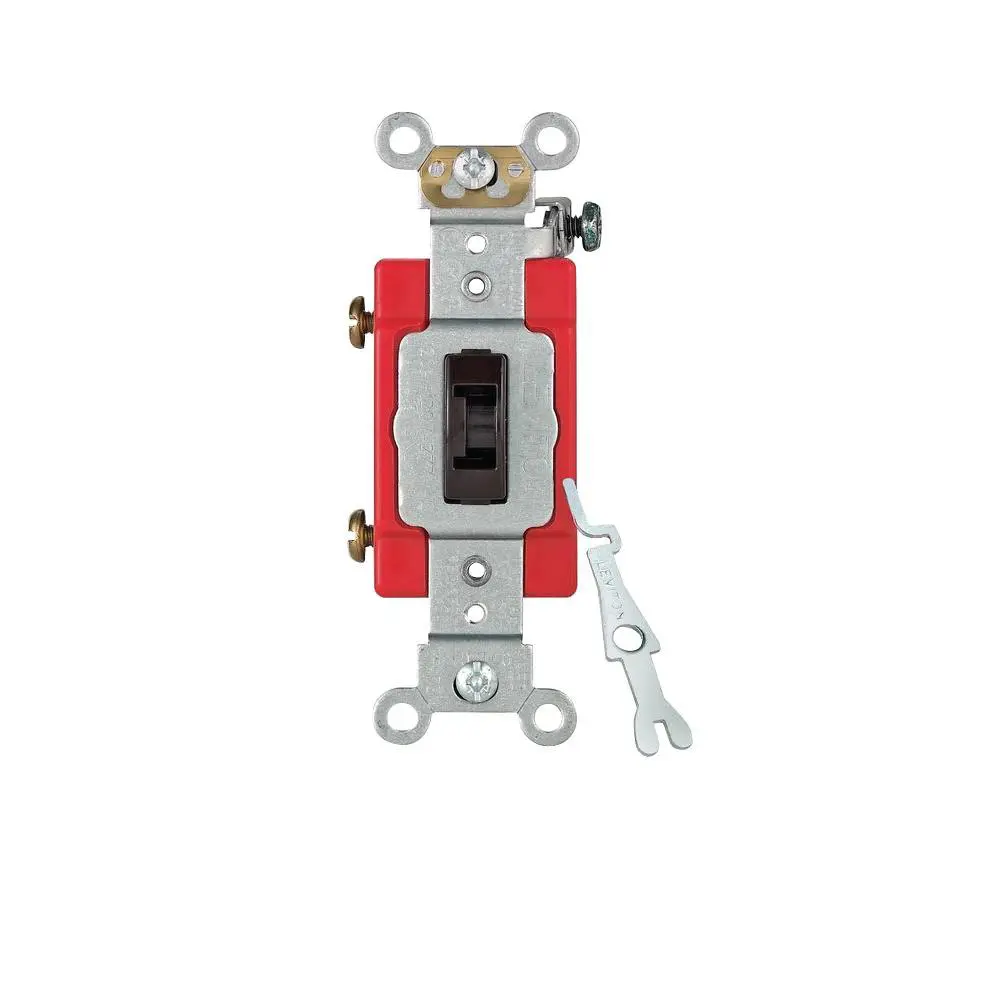 The Leviton 15/20 Amp Light Switch allows you to easily turn your lighting on or off from 1 convenient location. This switch is resistant to cracking for durability and features a brown finish for beauty. The UL listed switch can be used with a metal wall box for self-grounding safety and can be installed on 15/20 Amp circuits with back and side wiring.