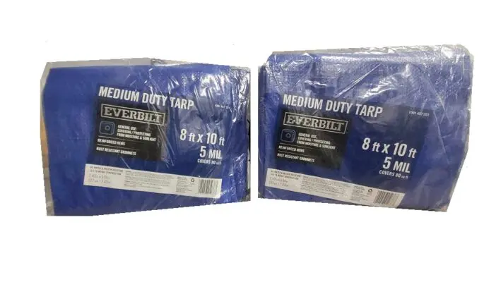 Everbilt medium-duty tarps are ideal for general purpose use and have many applications. It is widely used for construction, roof covering, agriculture, camping, boating, landscaping, outdoor furniture, and equipment covering. Features include thick heat-sealed seams reinforced with poly cords and rust proof aluminum grommets.