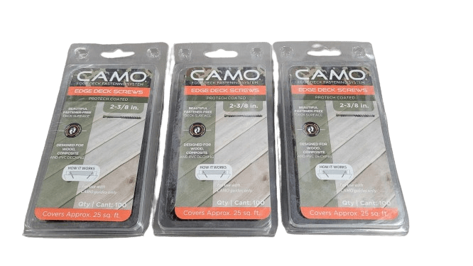 Hidden deck screws for any board.Hide your deck screws with the CAMO MARKSMAN system. Any wood or composite board in any square or grooved board profile, Edge hidden deck screws are the best way to enjoy the beauty of your deck top without seeing your fasteners.Edge hidden deck screws are installed on the edge of the deck board, hiding the fastener while protecting the face of the deck board. The rake tip design of the screw augers material as it is driven, leaving you with a fastener free deck surface that is less prone to splitting and cracking.Not only does this system improve the overall look of your deck, but it holds stronger than a traditional face fastener. When a deck board is face fastened, the head of the screw or nail is keeping your board in place. Edge hidden deck screws leverage the strength of the entire screw to hold your deck board in place.Edge Hidden Deck Screws are easy to install using either the CAMO DRIVE system or the Marksman system. Available in PROTECH exterior coating and 316 stainless steel.
