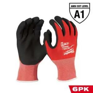 The MILWAUKEE 6-Pair Pack of X-Large Cut Level 1 Nitrile Dipped Gloves have SMARTSWIPE index fingertips that provide full access to touchscreen devices without having to remove the gloves. The nitrile dipped work gloves are designed to provide ultimate durability, all-day comfort and best in class dexterity for handling small objects. The nitrile dipped gloves have a textured palms for best in class grip performance. The work gloves are made of a nylon and lycra blend that provides all day comfort and wick away moisture.