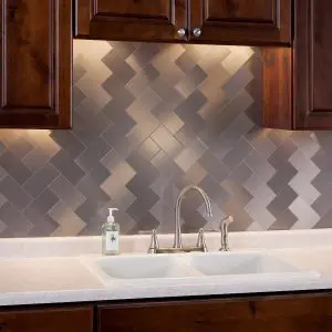 Aspect Metal is a decorative metal, peel and stick tile, which provides the look of a custom backsplash at a fraction of the cost. Design your own backsplash to be as elaborate or as uncomplicated as your personal style requires. These easy to use 3 In. x 6 In. tiles can be assembled in a wide variety of patterns to create your own personal look.