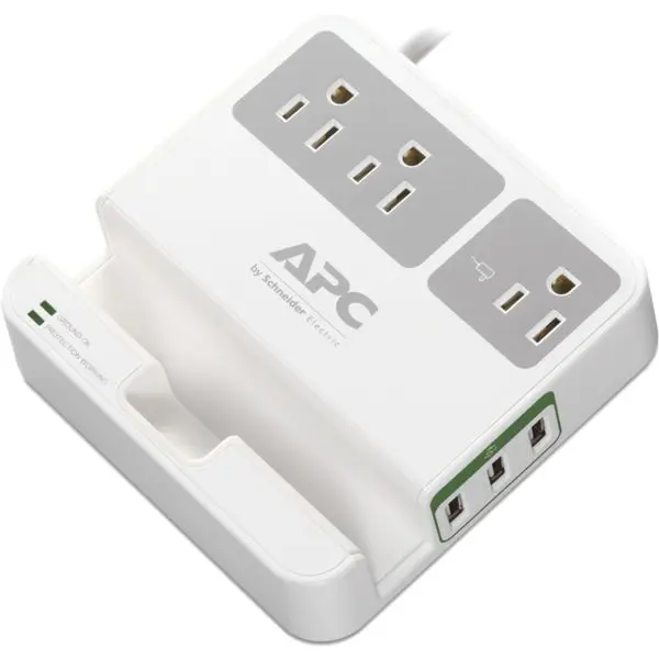 The APC Essential SurgeArrest P3U3 protects your electronic devices from surges and spikes during the charging process. This 1080 Joule surge protector and charging station features three surge protected outlets and three USB charging ports. The P3U3 surge protector has a 6 ft. power cord and a built-in smart device charging stand that enables you to use your device while it is charging. 2 LED indicators inform you of any faulty unit and wall wiring issues.