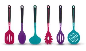 The Art and Cook contemporary design and extraordinary color make these utensils as beautiful as they are useful. Our silicone utensils set includes all of the essentials: Spaghetti Server, Solid Spoon, Slotted Spoon, Skimmer, Soup Ladle and Slotted Turner. Each utensil is made from high quality silicone that are heat resistant to 400 degrees and will protect your pots and pans from all scratches. The non-slip ergonomic handle makes these utensils not only easy to use but comfortable as well. Top rack dishwasher safe.