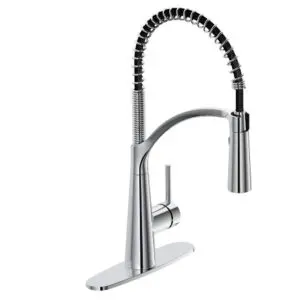 Enhance your kitchen with the professional style of this single-handle, pull-down kitchen faucet. Designed with a modern chrome finish, it features a spring-neck design for flexibility. The dual-function spray and stream offers additional versatility. Boasting a water-saving 1.8 GPM flow rate, this durable kitchen faucet includes quick connections and supply lines for easy installation on one- or three-hole sinks. It also comes with a drip-free cartridge and easy-clean removable coil.