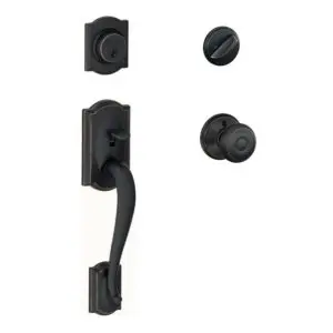 The Schlage Camelot Aged Bronze Single Cylinder Deadbolt with Georgian Knob Door Handleset is perfect for use on exterior front doors. The modest Georgian knob features symmetrical detailing throughout, while the Camelot handleset’s scalloped architectural details make any room charming and approachable. Our Aged Bronze finish is inspired by traditional design, featuring warm, copper tones that break through its darker, aged exterior. Plus, it’s been designed and tested with strength and durability in mind.
