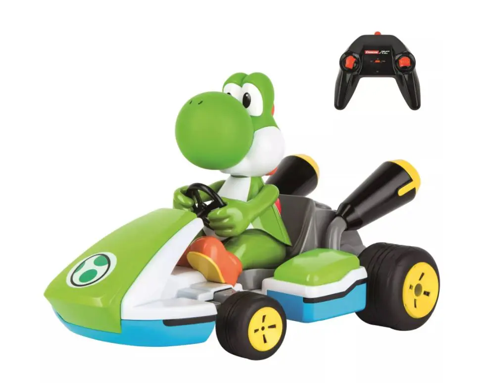Get ready to enjoy countless hours of racing fun driving with your favorite Officially Licensed Mario Kart character behind the wheel! The 1:16 scale vehicle measures 13.8-inches long and can accelerate up to 13-mph across multiple terrains including wet, slippery surfaces. A single charge of 80-minutes with the included USB charger provides up to 40-minutes of drive time leaving you with less time sitting around waiting for the battery to recharge. Turn on the sound function to play Mario Kart themed music from your controller while Yoshi leans to the side as you navigate through turns making your racing experience even more realistic. For more control and better handling, the vehicle features a differential gear, pneumatic tires, and a full-spring suspension. This remote control vehicle is ready to run and includes all vehicle and controller batteries!