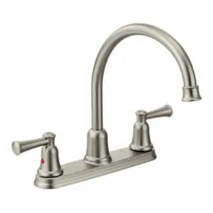 Cleveland 41611CSL Capstone Classic Stainless Two Handle Kitchen Faucet. Cleveland Faucet Group (CFG), a Moen Incorporated Brand, strives the to deliver real value in Kitchen and Bathroom Faucets, Shower Heads and In-wall Valves. CFG’s Products are designed to save buyers money, and deliver exceptional performance without cutting down the quality. This Cleveland 41611CSL Capstone Classic Stainless Two Handle Kitchen Faucet features a durable brass constructed body designed to withstand the repeated daily uses. This Faucet is ideal for everything from pots and pans, to rinsing off dirty vegetables. The Two Metal Lever Handles mount on Ceramic Cartridges, and provide users with easy control. This Faucet also includes an elegant high-arc spout that reaches all areas of the sink. This complete faucet also comes with all mounting/installation hardware, and a stunning Classic Stainless Finish.