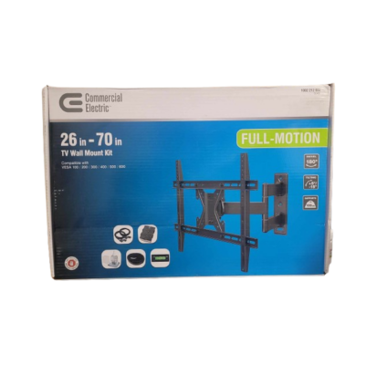 Get the best seat in the house and achieve the perfect viewing angle with the Full Motion TV Wall Mount from Commercial Electric. Mount your television securely to the wall and allow for multiple viewing angles with 180 degree swiveling capacity and 15 tilt options. Made for televisions from 26 to 70 in., this versatile mount can handle up to 100 lbs. Pulls out to 19.6 in. and smoothly returns back in to 3.3 in. Installing and adjusting your wall mounted television has never been easier. Offers a quick and easy installation on a single wood stud.