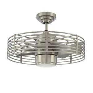 The Designers Choice Collection Enclave 23 in. ceiling fan features a horizontal cage in satin nickel for a unique and attractive style. Its sturdy steel blades deliver whisper-quiet cooling to small spaces. The dimmable 75W halogen light adds the finishing touch.