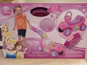 A beautiful royal coach is awaiting your little princess. This innovatively designed combination 2-in-1 wagon/ride-on is action packed and ready to go. In the ride-on mode, your little one rides in comfort as she holds the easy grip handle that plays princess sounds and a tune at the touch of a button. The front end has a jewel pocketbook that really opens so she can store her most precious gems. Release the handle from the locked position with one touch of a button to the wagon mode to tow along her favorite toys in the large under seat storage area. It’s great for indoor or outdoor play!