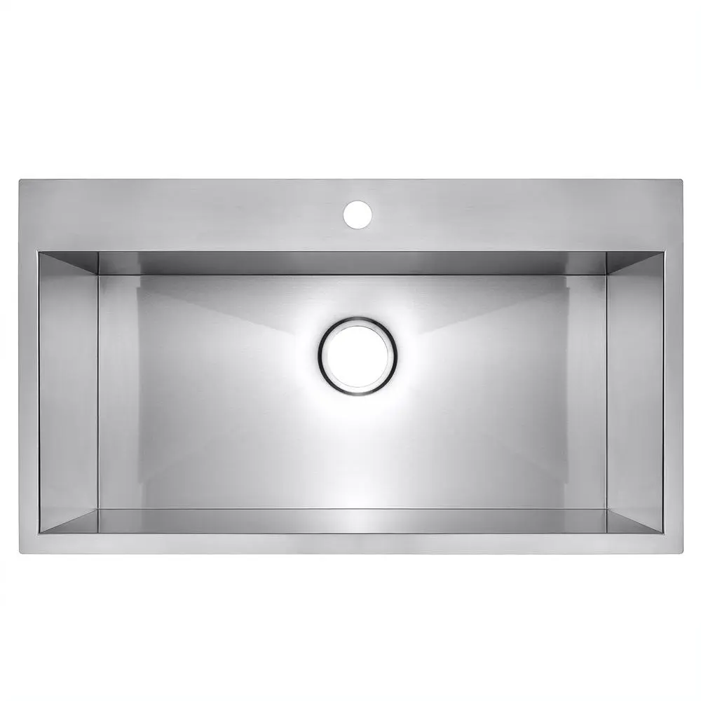 Upgrade your kitchen sink with the Golden Vantage 32″ KS0046 handmade topmount sink. Its clean straightforward design combined with the zero radius feature make this sink perfectly at home in many modern kitchens. Sound deadening is found within to minimize any potential clanging. Built from sturdy T304 grade 18-gauge stainless steel, this sink is sure to remain strong and useful with proper care. With the interior measuring in at 32″ L x 18″ W x 9″ D, this sink has plenty of space for washing produce or stacking dishes.