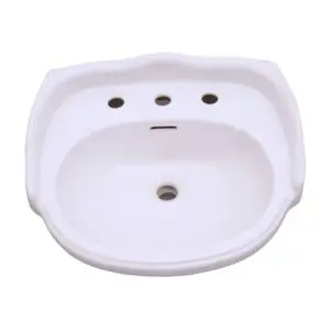 This Victorian looking basin will be sure to add old world charm to any bath. At 26 In. wide it is just the right dimension to be used in most baths. By adding the required pedestal you get a full 36 1/2 In. high lavatory including the backsplash. Shown here with a 4 In. faucet drilling, it can also be ordered with an 8 In. widespread drilling If the old world look is what you are craving then this is the pedestal sink for you. Shown here in bisque it is also available in white.