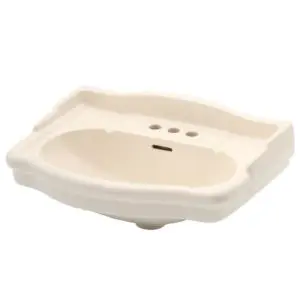 At 23 5/8 In wide this is a smaller version of the English Turn basin. The Edwardian look and the smaller size would compliment many powder rooms. When used with the English Turn toilet you would have a perfectly matched bathroom. This basin is shown with a 4 In faucet hole drilling. It can be ordered in an 8 In drilling for a more elegant look. A larger size basin is available. Shown here in bisque in can also be ordered in white.