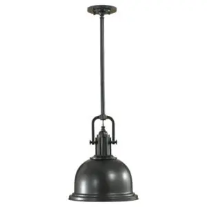 The Feiss Lighting Parker Place 1-light mini pendant in dark bronze is the perfect way to achieve your desired fashion or functional needs in your home. This retro industrial collection reminiscent of turn of the 19th century lighting, features brushed steel and dark bronze finishes accented with pearl glass and a special touch of light in the open work casting above the beautifully shaped domes. Group the pendants over a kitchen isle or introduce a fresh, bright look to your dining room or kitchen table, this group, enclosed with pearl glass at the bottom of the domes, casts a beautiful warm light wherever they are hung. Add one of the coordinating mirrors to complete the fashionable look of your room.