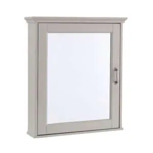 The beautiful Ashburn 23 in. poplar-framed medicine cabinet with mirror will provide a touch of elegance for your bathroom. Intricate crown molding accents its understated Grey finish for a stylish look. It features a satin nickel door handle, and two adjustable interior shelves for customized storage. The medicine cabinet is designed to be hung vertically, and mounting hardware is pre-attached for convenient installation.