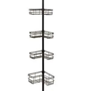 The Glacier Bay “L” Style Tension Pole Shower Caddy in Bronze helps organize any bath or shower. Its 4 large basket shelves, including 1 deep shelf for taller items, can hold bottles of shampoo, conditioner and other bath items. The caddy installs easily and is held firmly in place using a tension-mount pole that extends to fit spaces up to 8 ft., 1 in. H. No tools are needed for installation.