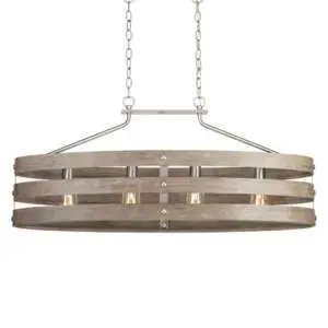 3-circular bands wrap together to create an open design. Hand painted to emulate weathered gray driftwood, the four-light oval pendant’s Brushed Nickel frame is accented by smooth knobs and encases exposed bulbs. The wood grained texture complements rustic farmhouse home decor.