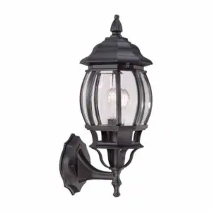 This Hampton Bay 6 in. outdoor wall lantern features a solid black finish and eight sides of clear, beveled glass. This simple, elegant design compliments any exterior decor. These fixtures are built with cast aluminum to last and they are suitable for use in wet locations.