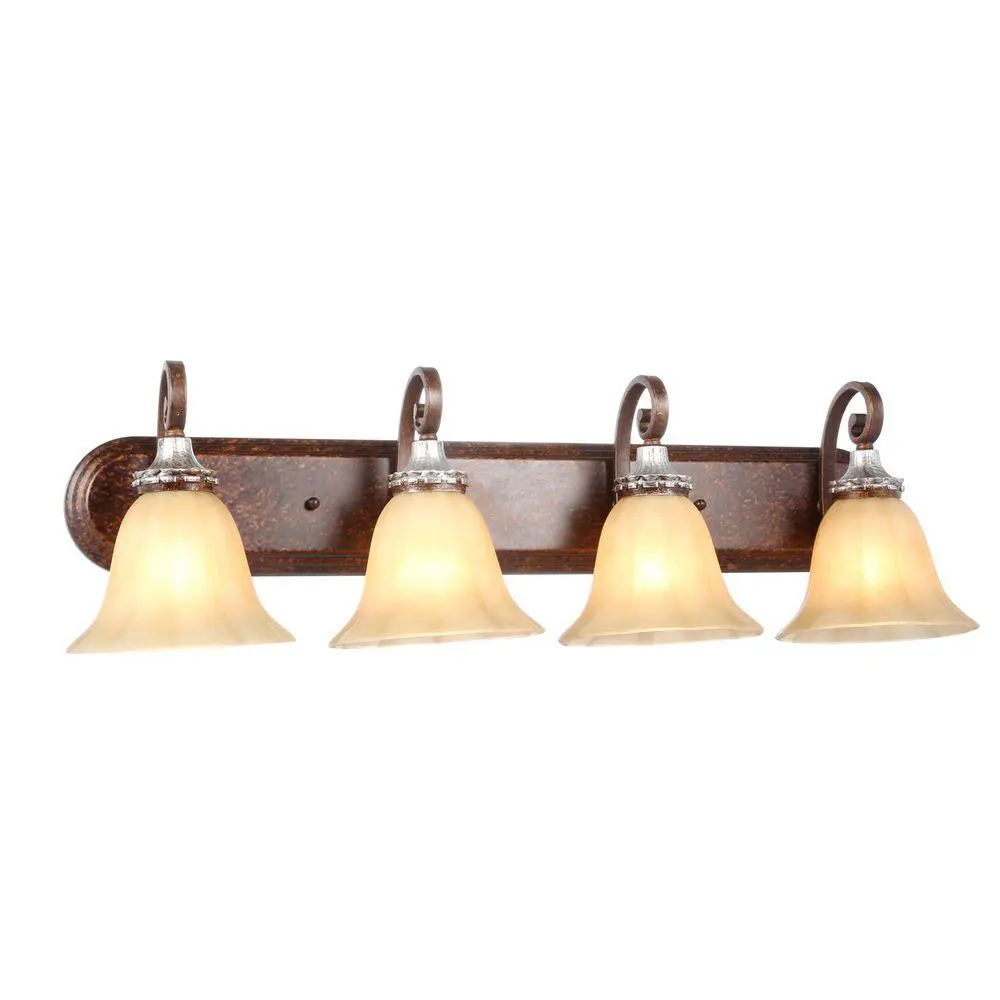 Upgrade your bath or powder room in understated elegance with the Hampton Bay 4-Light Oxide Brass with Mystique Silver Bath Light. Beautifully detailed and finished in a warm and rich oxide brass with mystique silver accents, the bell-shaped glass shades will provide plenty of bright and even illumination. Easy to install and maintain, pair with similar pieces from Hampton Bay for a polished look you will enjoy and friends will admire.