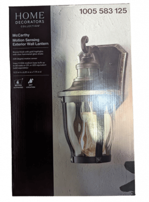 This traditional 1-Light McCarthy Motion Sensor wall mount lantern from Home Decorators Collection is beautifully sculpted in die-cast aluminum for a classic look that is sure to enhance your outdoor decor. The hand applied bronze finish features gold highlights to give this fixture a timeless look. The clear hammered glass lets the one 60-Watt medium based bulb (not included) shine through to illuminate your outdoor surroundings. 220° of motion sensing, it detects motion up to 30 ft. away.